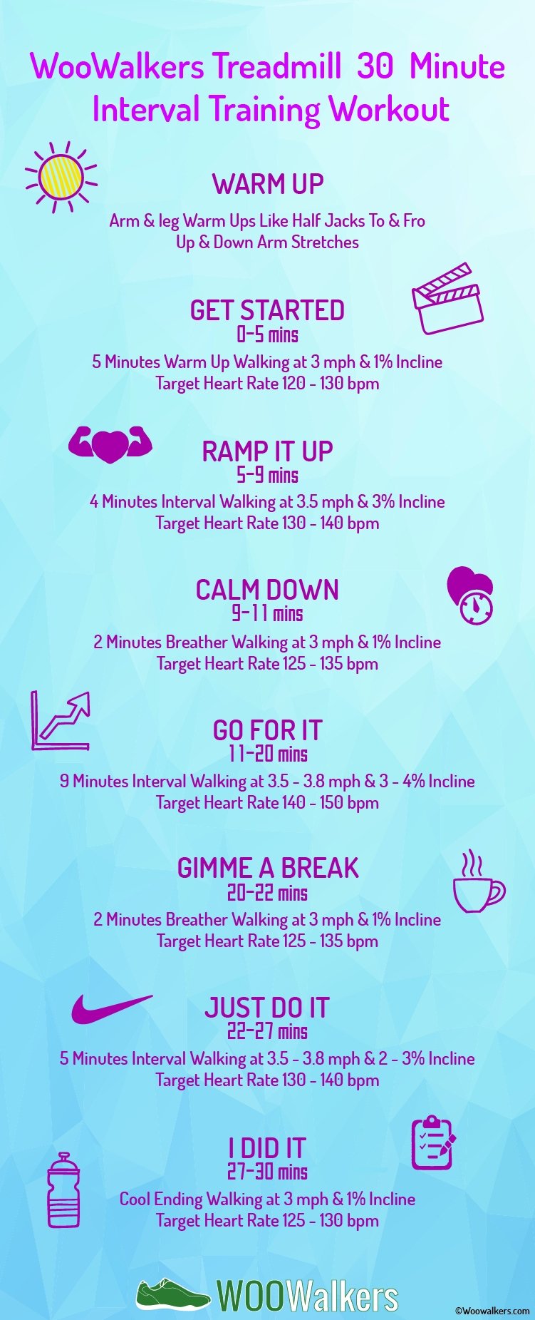 - 27 – 30 mins – Cool down with 3 mins at 1% and 3 mph.